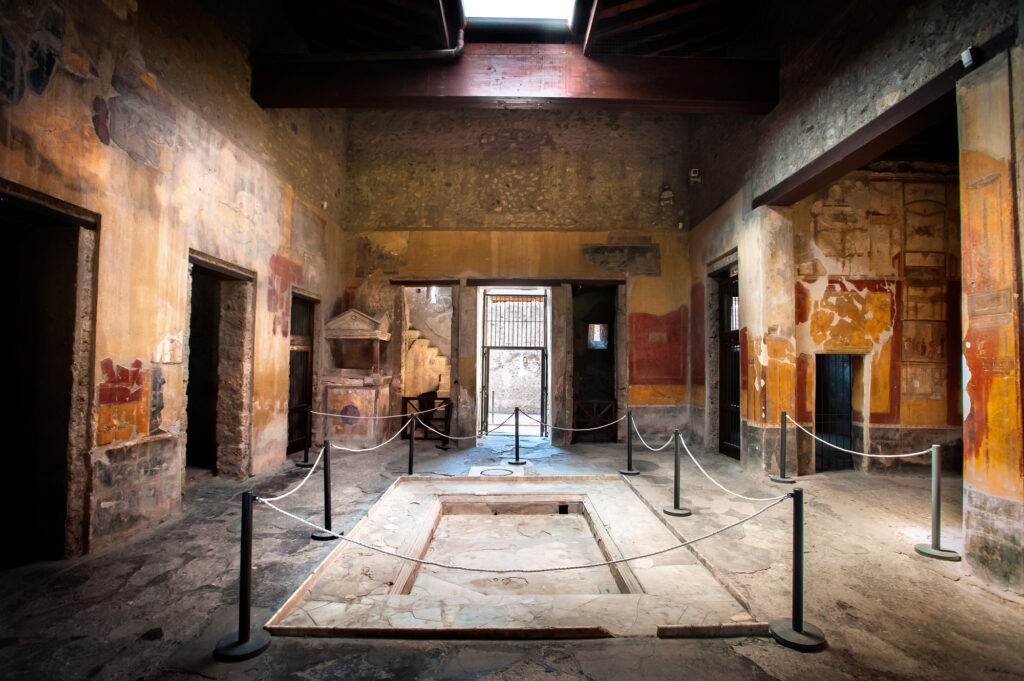 L’atrio rappresentava il fulcro principale della vita domestica delle abitazioni Pompeiane. Era spesso coperto da un tetto aperto chiamato “compluvium”, che permetteva l’ingresso della luce naturale e la raccolta dell’acqua piovana in una vasca sottostante chiamata “impluvium”. L’acqua raccolta nell’impluvium, grazie ad una cisterna posizionata al di sotto della stessa, veniva utilizzata per tutte le faccende domestiche, quindi per il lavaggio panni e per cucinare. Un metodo utilizzato fino a quando a Pompei non è stato realizzato l’acquedotto che poi ha portato l’acqua nella maggior parte delle case.