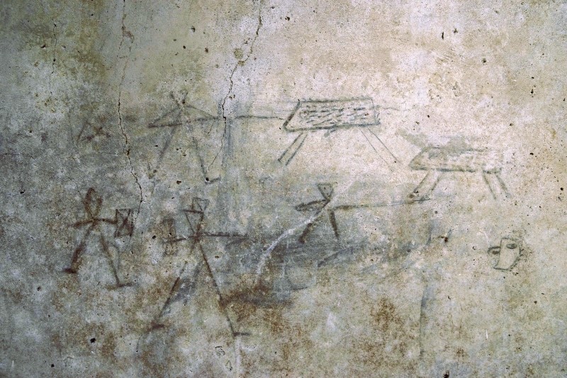 The drawings found in the cenacle house were clear and unequivocal; these were gladiators intent on fighting in the arena of the amphitheater. Gladiators who were depicted with arms and legs coming straight out of their heads. Typical of drawings made by children about 5/7 years old who approach drawing at first and tend to represent the human figure using only strokes.